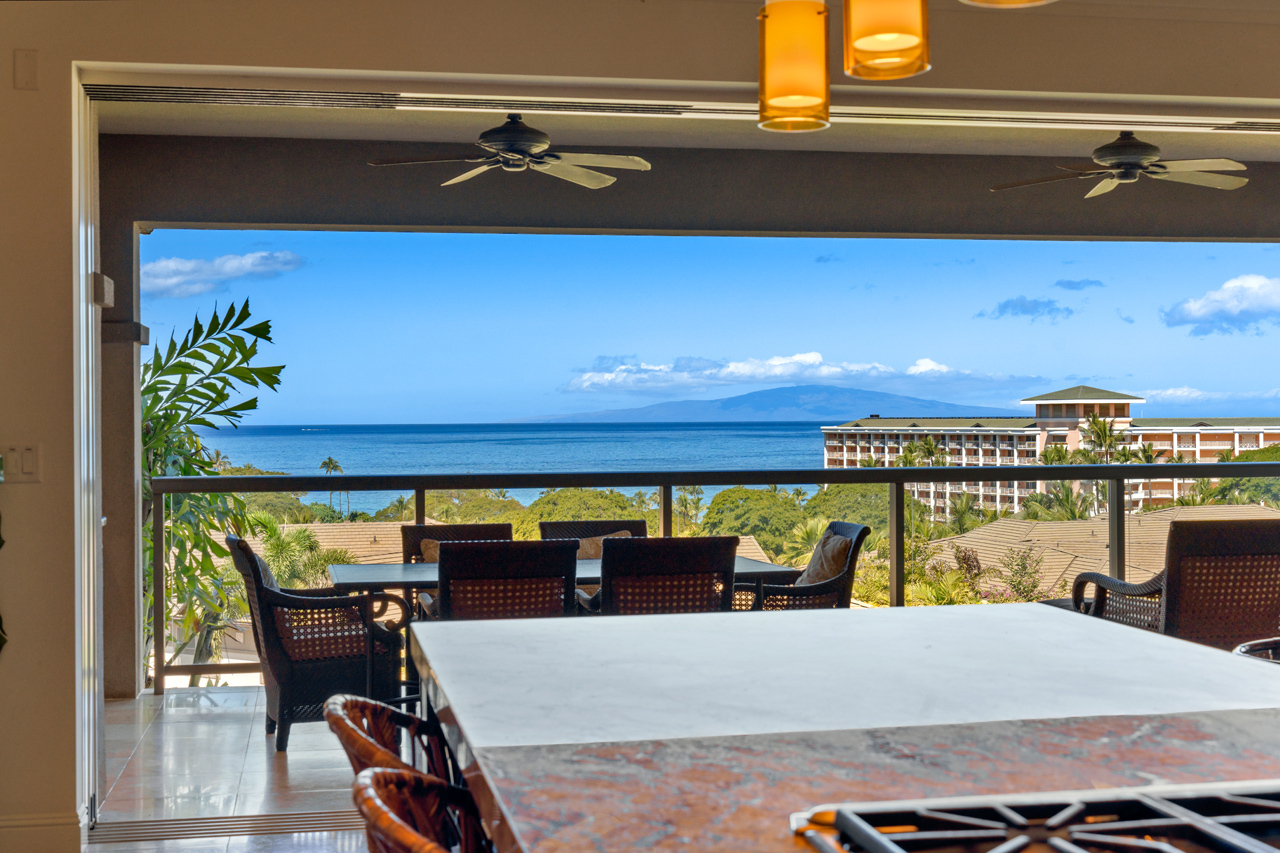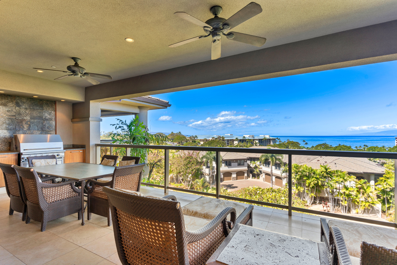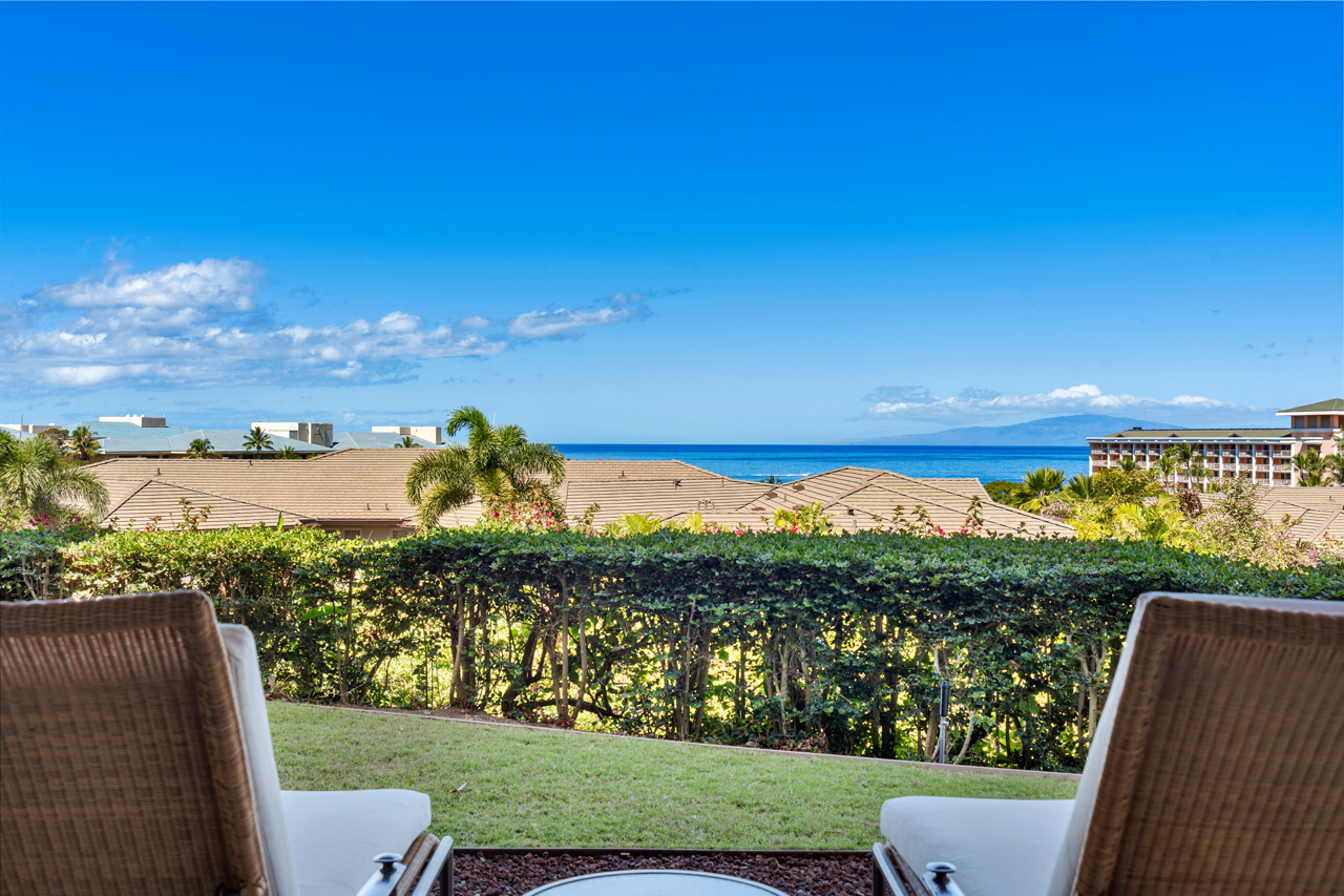 Ascend the stairs to the great room of Ho'olei Villa 57-2 and be rewarded with one of the finest ocean views in Wailea! This spacious two-story, 3 bedroom, 3.5 bath townhome-style Villa has 2,426 square feet of living area and is gracefully located on the desirable third row in the heart of one of Wailea's most sought after vacation communities. Ho'olei 57-2 is perfectly positioned to maximize ocean views, which can be seen from almost every room, while offering an exquisite sense of privacy and seclusion. This Villa has the popular Maile floor plan which has approx 27-foot wide covered lanais on both levels as well as a spacious upstairs suite large enough to fit two queen sized beds. Kitchen features custom cherry wood cabinets, two Sub Zero refrigerators with matched cabinet facings, and Wolf stainless steel appliances throughout. Dual-paned Fleetwood glass doors retract completely into the wall to seamlessly connect the great room with the large upstairs lanai. Nearby are all of Wailea’s many resort amenities including the best beaches on Maui, elite shopping opportunities, first class restaurants, golf and tennis.