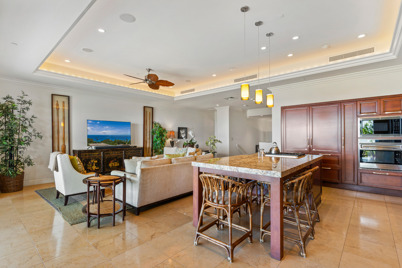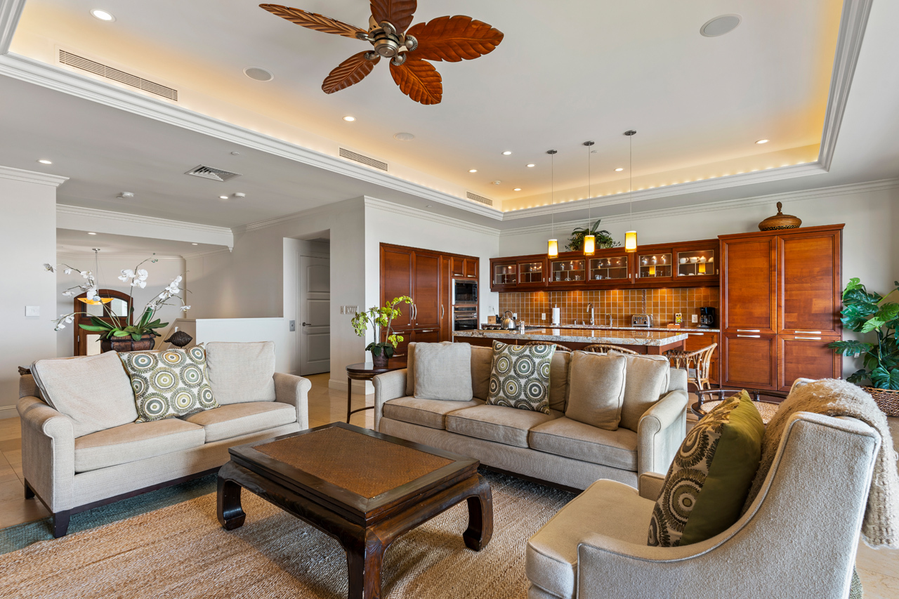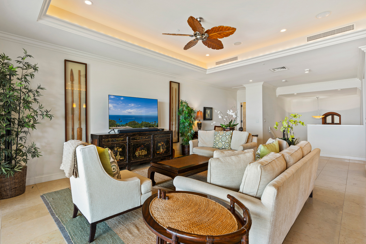 Ascend the stairs to the great room of Ho'olei Villa 57-2 and be rewarded with one of the finest ocean views in Wailea! This spacious two-story, 3 bedroom, 3.5 bath townhome-style Villa has 2,426 square feet of living area and is gracefully located on the desirable third row in the heart of one of Wailea's most sought after vacation communities. Ho'olei 57-2 is perfectly positioned to maximize ocean views, which can be seen from almost every room, while offering an exquisite sense of privacy and seclusion. This Villa has the popular Maile floor plan which has approx 27-foot wide covered lanais on both levels as well as a spacious upstairs suite large enough to fit two queen sized beds. Kitchen features custom cherry wood cabinets, two Sub Zero refrigerators with matched cabinet facings, and Wolf stainless steel appliances throughout. Dual-paned Fleetwood glass doors retract completely into the wall to seamlessly connect the great room with the large upstairs lanai. Nearby are all of Wailea’s many resort amenities including the best beaches on Maui, elite shopping opportunities, first class restaurants, golf and tennis.